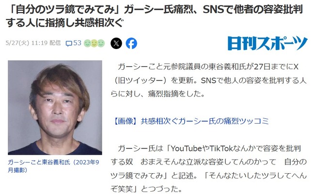 【X】ガーシー氏痛烈、SNSで他者の容姿批判する人に「自分のツラ鏡でみてみ」指摘で共感相次ぐ【東谷義和】 AKB48 X Facebook はてブ Pocket LINE コピー 2025.05.28 元記事リンク: https://akb48taimuzu.livedoor.biz/archives/62383291.html