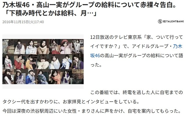 【闇深?】乃木坂46メンバー、月給5万円と判明!!【高山一実がグループの給料について赤裸々告白】 乃木坂46 X Facebook はてブ Pocket LINE コピー 2025.06.13 元記事リンク: https://akb48taimuzu.livedoor.biz/archives/62420199.html