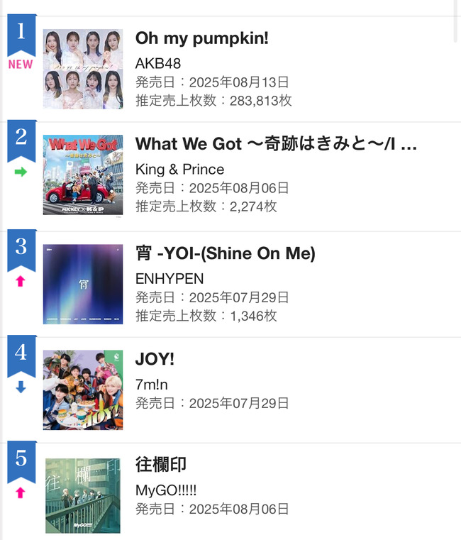 【速報】AKB48新曲「Oh_my_pumpkin 」初日売上283,813枚で1位【AKB48 66thシングル Oh my pumpkin!】 AKB48 X Facebook はてブ Pocket LINE コピー 2025.08.14 元記事リンク: https://akb48taimuzu.livedoor.biz/archives/62565265.html