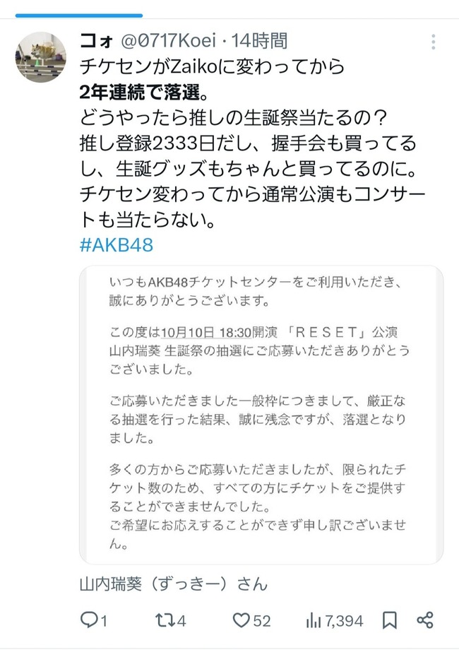 【悲報】AKBオタ「2年連続で生誕祭落選、チケセン変わってから通常公演もコンサートも当たらない。」【AKB48山内瑞葵】 AKB48 X Facebook はてブ Pocket LINE コピー 2025.10.08 元記事リンク: https://akb48taimuzu.livedoor.biz/archives/62692028.html