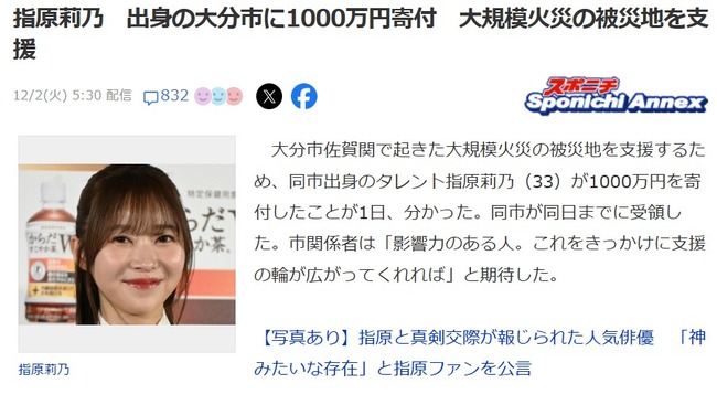 指原莉乃さん大分市の大規模火災の被災地に1000万円を寄付【2020年には2000万円・元AKB48/元HKT48さっしー】 指原莉乃 X Facebook はてブ Pocket LINE コピー 2025.12.03 元記事リンク: https://akb48taimuzu.livedoor.biz/archives/62825457.html