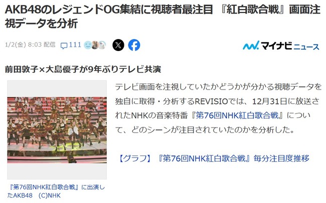 【朗報】AKB48 NHK紅白歌合戦・画面注視ランキング 73.8%で1位に輝く 🏆【第76回NHK紅白歌合戦・国民的アイドル】 AKB48 X Facebook はてブ Pocket LINE コピー 2026.01.03 元記事リンク: https://akb48taimuzu.livedoor.biz/archives/62905075.html