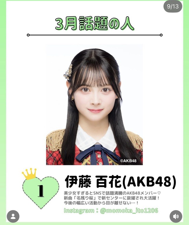 【朗報】AKB48・伊藤百花、渋谷109が選ぶ「話題の人」 1位に 🥇 【トレンド速報・いともも】 AKB48 X Facebook Hatena Bookmark Pocket LINE Copy 2026.03.04 元記事リンク: https://akb48taimuzu.livedoor.biz/archives/63048142.html
