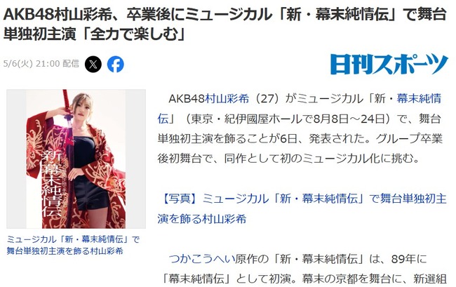 村山彩希、卒業後にミュージカル「新・幕末純情伝」で舞台単独初主演【AKB48ゆいりー】 村山彩希 X Facebook はてブ Pocket LINE コピー 2025.05.08 元記事リンク: https://akb48taimuzu.livedoor.biz/archives/62339738.html