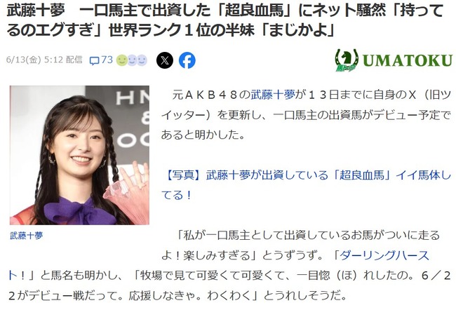 【元AKB48】武藤十夢、一口馬主として出資している馬が6月22日デビュー!【超良血馬ダーリングハースト】 武藤十夢 X Facebook はてブ Pocket LINE コピー 2025.06.16 元記事リンク: https://akb48taimuzu.livedoor.biz/archives/62423011.html