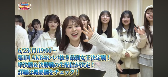 【6月23日 19時】第1回AKB48ババ抜き最弱女王決定戦準決勝&決勝戦生配信決定!!【AKBの素を出すちゃんねるYouTube】 AKB48 X Facebook Hatena Bookmark Pocket LINE Copy 2025.06.23 元記事リンク: https://akb48taimuzu.livedoor.biz/archives/62442529.html