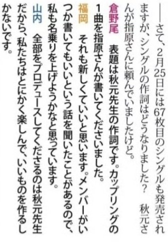 【速報】AKB48 67thシングルのカップリング曲を指原莉乃が作詞したことが明らかになる!!! 指原莉乃 X Facebook はてブ Pocket LINE コピー 2026.01.31 元記事リンク: https://akb48taimuzu.livedoor.biz/archives/62974053.html